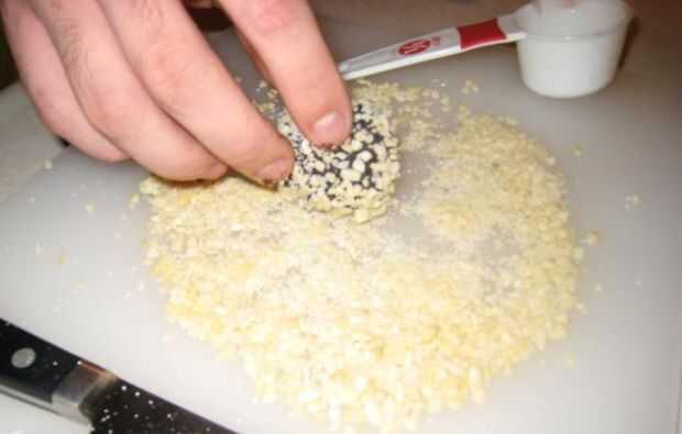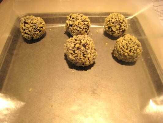 7) rodar las bolas en las nueces picadas, coco o salpicaduras.