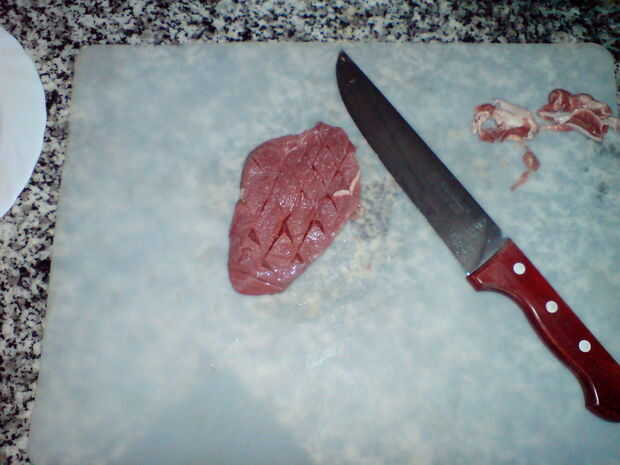 luego de hacer algunos cortes en forma de diamante en ambos lados del bistec. ¡Careful, no cortar profundo!.