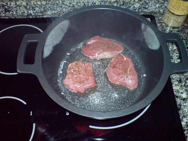 Una vez que el pan es bien caliente, poner los filetes en ella. Aproximadamente después de 40 segundos, convertirlos en el otro lado. Hacer eso 2 o 3 veces hasta que estén marrones.