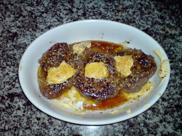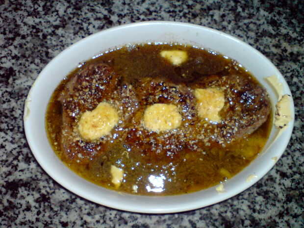 Una vez que los filetes estén dorados, ponerlos en el plato hondo sobre la mantequilla y el ajo. Poner otra cucharadita de mantequilla sobre cada filete y espolvorear otra vez algún polvo de ajo y la cebolla. Verter 2 cucharadas de aceite de oliva sobre los filetes.