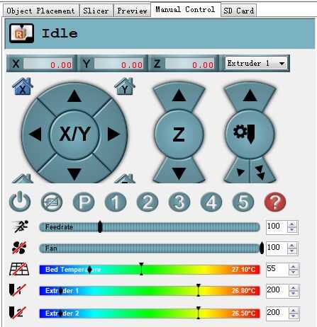 4. Haga clic en el icono de cama caliente y extrusión, observar si es calentamiento hasta la temperatura preestablecida y mantiene en ese valor. 5. cuando la temperatura de extrusión superar 170 ° C, elija extruder1 y extruder2 respectivamente, puede moverlos y comprobar sus indicaciones.
