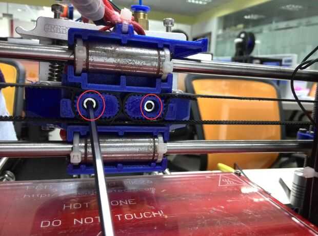 En primer lugar, se pueden ajustar una extrusora para hacer paralelas a la superficie de la cama caliente (al igual que de nivel para la extrusora solo), haga clic en el botón de Z Inicio para ajustar la distancia entre la boquilla y la cama caliente, asegúrese de que las distancias verticales de la boquilla a las cuatro esquinas de la cama son los mismos. A continuación, puede ajustar la distancia entre la segunda extrusora y cama caliente por ajustar los tornillos, como se muestra en la siguiente imagen: suelto los tornillos, puede ajustar la distancia entre dos extrusoras y cama caliente.