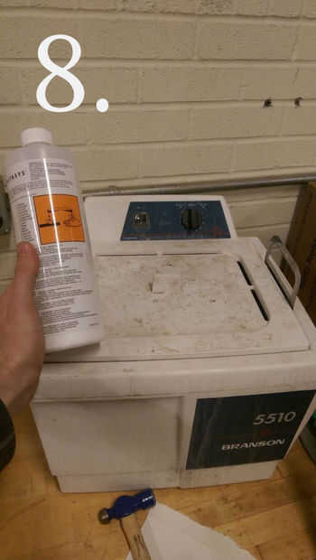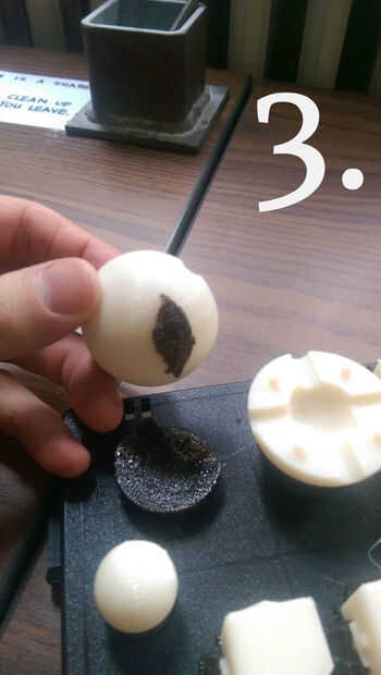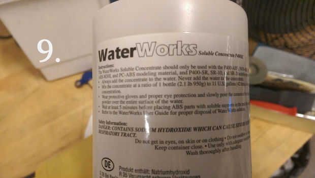 Después de quitar las piezas de la bandeja de impresión, hay unos últimos pasos a seguir antes de someterse a un modelo final presentable. El material de apoyo restantes debe eliminarse antes de que piezas se pueden montar. La forma eficaz de más tiempo para remover el material es a mano, usando selecciones y otros objetos metálicos que permiten que usted consiga difícilmente alcanzar lugares. Tener mucho cuidado al retirar el material de apoyo de mano, puede rayar, crack y dañar sus piezas y también le puso las manos y los dedos corren el riesgo de ser poked y apuñaló a. Después de haber eliminado tanto material como sea posible, el resto puede ser disuelto por un limpiador cáustico de piezas. El modelo de piezas limpiador que uso es ultrasónico y lleva hidróxido de sodio disuelto en agua destilada para disolver el material de soporte soluble. Asegúrese de consultar Stratasys al elegir sus piezas limpiador y siga siempre las instrucciones de cerca cuando se usa uno. También, use gafas protectoras y guantes de protección cuando utilice la solución cáustica.