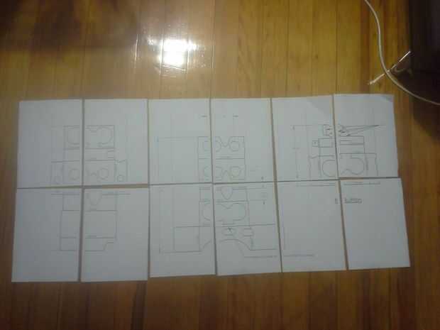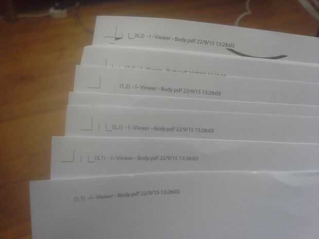 Si seleccionó etiquetas en el cuadro de diálogo Imprimir que puede utilizar las coordenadas para colocar las hojas, de lo contrario sólo averiguarlo de la imagen. Creo que las marcas de corte son los rayados poco en las esquinas y los rótulos son los encabezados con las coordenadas. Así por ejemplo (2, 5) va en la fila 2 º, 5 º página de la izquierda.