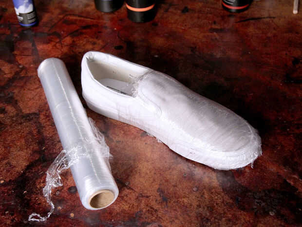 Cubrir el zapato en tres o cuatro capas de envoltura de plástico. Algunas marcas de lápiz de pintura pueden disolver la capa superior de plástico, para que capas extras evitará que la pintura llegando a la zapata.