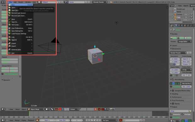 Abrir Blender y vaya a la ficha de archivo haga clic en nuevo y después haga clic otra vez para confirmar. Esto debería borrar todas las configuraciones y coloque un cubo en blanco en el centro. Si no pasa nada, es porque la configuración predeterminada está configurada. Ahora pasemos.