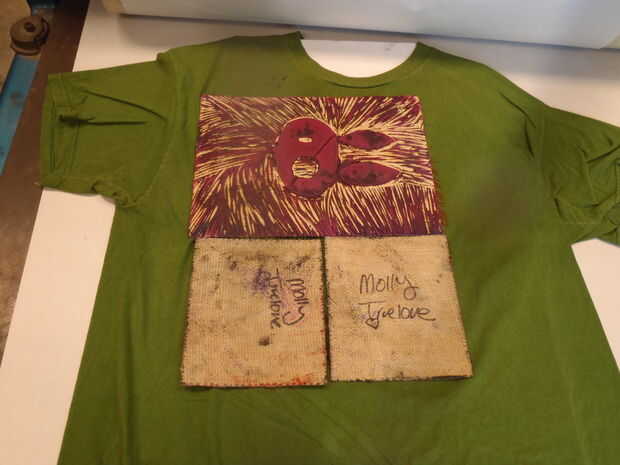 Ejecutar su segundo conjunto de bloques a través de la prensa como lo hizo antes. Si usted no talla hacia fuera 4 cuadras (como debo tengo) colocar otro trozo de linóleo sobre la tinta húmeda para proteger de la manta de la prensa.