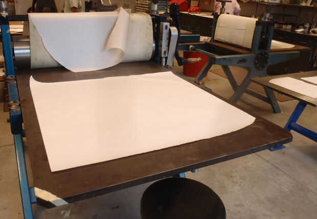 Pieza grande lugar de papel de periódico en la prensa para proteger la superficie. Guarde un pedazo más grande para colocar sobre su camisa cuando va a través.