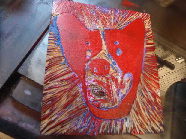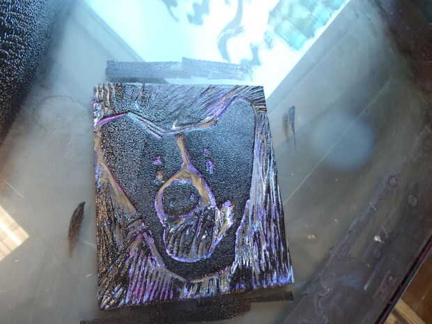 Tomar el rodillo y tinta por su bloque de linóleo. Tinta debe mirar muy vibrante y no opaco y delgado. La mejor cobertura en el bloque, será mejor el color en la camisa. Elegí un bloque que hice de una foto de mi perro. Se ha convertido en una impresión super popular!