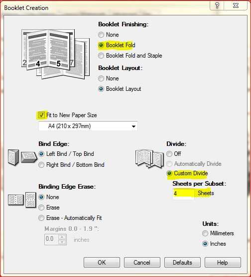 • Haga clic en "Custom Divide" y decidir cuantas hojas quieres en cada "firma". Este número debe tratar y dividir en el número de páginas que tiene. es decir 4 hojas por subconjunto entrará en 64 (64 ÷ 4 = 16)