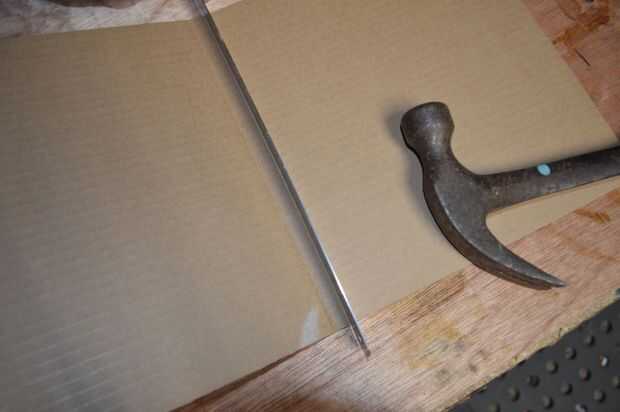 3. para hacer el pliegue tome usted una regla de metal. Esto tiene un borde recto, plano que funciona perfectamente. Utilice un martillo y golpeó a la regla a su lado hasta que tenga un pliegue en la cartulina. Doble las tapas cerradas y asegurarse de que la espina dorsal se dobla como debería.