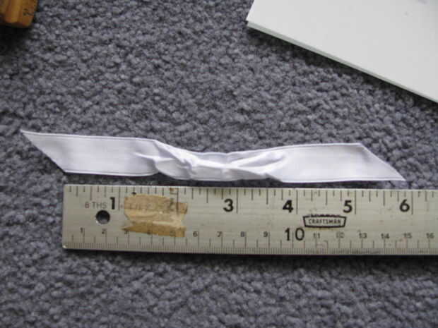 usé 0,75" cinta de raso cortar en longitudes de 5" plus extra para acomodar el ángulo. Dejando un poco de la cinta extra en los extremos es sabio, porque es difícil evitar que se deshilachen los extremos durante los próximos pasos. Usted necesitará un pedazo de cinta para cada invitación.