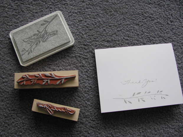 El kit que contenía la vitela y papel hecho a mano vino con una "tarjeta de respuesta" que no lo usamos. He decidido incluir una tarjeta postal de respuesta con la invitación original para guardar la tarjeta de respuesta y el sobre para una nota de agradecimiento. He usado el mismo diseño de la hoja sello de caucho y plata cojín de estampilla, junto con un sello de goma "gracias", para crear una nota de agradecimiento que empareja, que hizo las invitaciones originales en mano para enviar notas de agradecimiento cuando dones vienen pulg