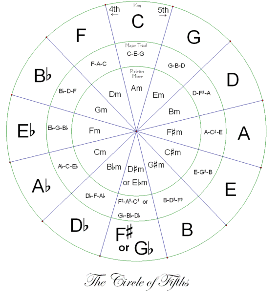Suena complicado pero en realidad no es. Mira la foto para más detalles, pero la idea principal es mostrar los pisos/objetos punzantes en cada tecla. No puedo enseñarte el círculo de 5ths, tienes que aprender más de lo mismo. Esperemos que el diagrama explicará mucho.