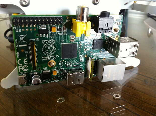 Monte el Raspberry Pi en los pernos o los separadores instalados en el cabezal móvil. El puerto de HDMI debe ser varios milímetros por encima de la superficie de la mesa.
