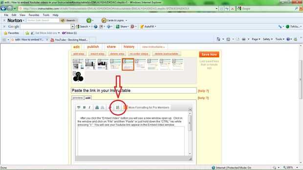 Poner cualquier texto que desee en el Instructable y coloque el cursor donde desea que el vídeo de Youtube aparecen a continuación, busque el botón incrustar Video en la página Instructable. En la imagen, verá el botón de un círculo rojo con una flecha roja apuntando hacia él. Haga clic en ese botón.