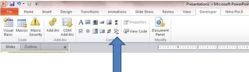 • Una vez haya hecho clic en "Developer", usted verá una pantalla como la mostrada arriba.  Hay 12 botones con una etiqueta de "Controles" debajo de ellas donde se encuentra el botón "Más controles".  Esto parece un martillo y una llave cruzada, si usted está teniendo problemas para encontrar, mantenga el ratón sobre cada botón, y aparecerá el título del botón.  Antes de hacer clic en más controles, asegúrese de que estén en la diapositiva donde quieres colocar tu video.  Una vez que ha encontrado el botón de "Más controles", haga clic en él.