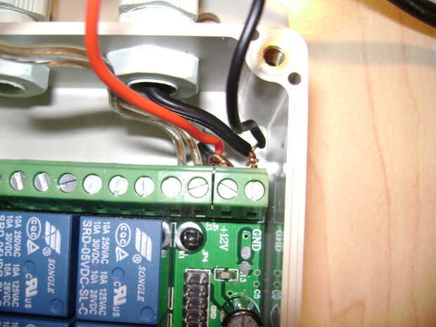 Recomiendo los cables de cableado en el dispositivo primero. Tomar el cable de alimentación de 12V DC cigarrillos y tira de los extremos de los cables y deslice el cable por uno de los puertos en el lado del dispositivo. Estos puertos se pueden apretar para asegurar que el dispositivo es resistente a la intemperie. Alimenté el alambre a través del puerto más cercano al conector de alimentación, pero si los cables son de mayor calibre puede ser difícil. Considere la posibilidad de correr el cable a través del puerto lejano. El llavero remoto permanecerá dentro del aparato y sus alambres no se ejecutarán a través los puertos.