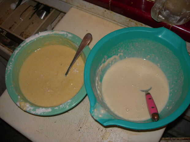 Mezclar todos los ingredientes secos, luego agregue los huevos y la leche. Mezcle hasta libre de tumor.