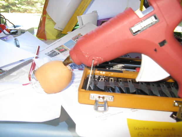 podría querer blanquear el huevo primero aunque (solo un pensamiento) ahora para el pegamento caliente use una superficie plana, porque la última vez que usé una superficie no plana quemé mi auto (quemadura de 2 º grado en mi ombligo) una vez que usted mismo una superficie se calentará eso arma de pegamento encima de esperar unos diez minutos hasta su caliente bastante (surf instructables mientras su en él) luego poner pegamento en ese huevo pero primera cubierta el agujero más pequeño en el extremo más pequeño del huevo con una toalla de papel comenzar a poner cuidadosamente pequeñas cantidades de pegamento caliente en un momento.