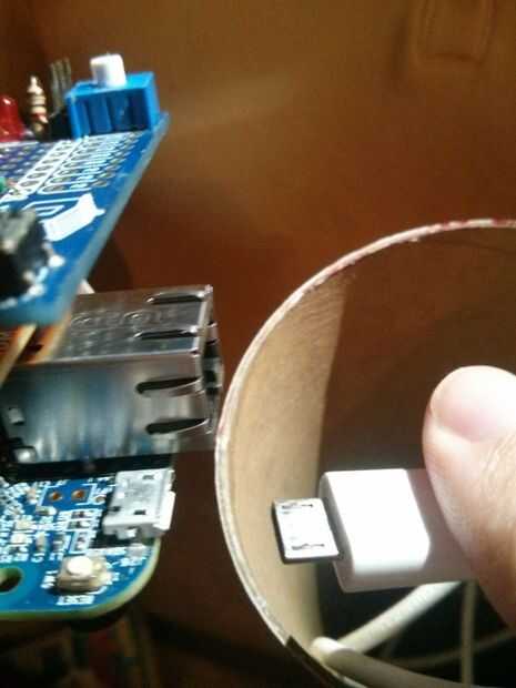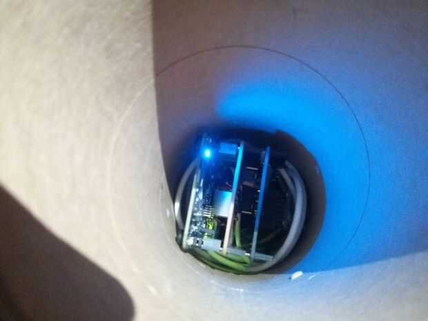 Una vez que el relleno está en la parte inferior, colocar la fuente de alimentación conectado a un USB cable Micro-USB hasta abajo como se pueda, preferiblemente colocarlo dentro el relleno como se ve en la segunda imagen. A continuación enchufe el lado MicroUSB del cable del módulo de aviónica como se ve en la tercera imagen. El módulo debe encender, si el estado del led es un cian sólido Asegúrese de que usted tiene una tarjeta MicroSD que se le atribuye y pulsa el botón reset una vez para reinicializar todo, si empiezan a parpadear azul en 1/4 intervalos de segundos indicando su listo para comenzar a grabar. No iniciar la grabación, para la bobina ahora el resto de la cuerda del USB en el área de carga girando el módulo y finalmente montar el módulo como se ve en la cuarta imagen. Traer un rollo de cinta el segundo bloque de espuma junto con el resto del cohete a la plataforma de lanzamiento del embalaje.