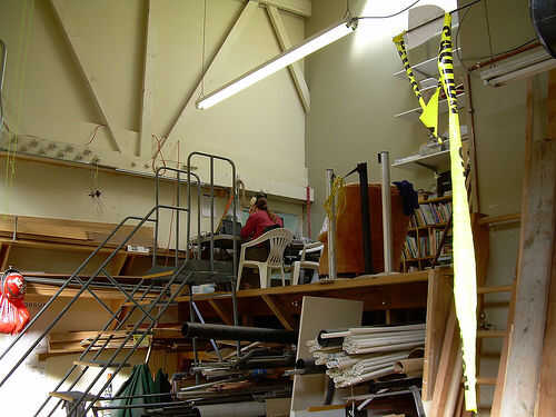 Vieron docenas de edificios y miró seriamente a 10. En un edificio en Emeryville, una tienda de construcción High-End había ido a quiebra y despejado hacia fuera, dejando todas sus herramientas (estos iban a ser subastados) y muebles. Había cuatro hermosos escritorios con una sala de conferencias en la parte delantera y un almacén con tragaluces en la parte posterior. Tenía una sensación de destino-como definitiva: 4 escritorios y 4 socios; un compresor de aire con tuberías, reguladores y accesorios ya instalados; muchos armarios empotrados, cajones y áreas de trabajo; y un área de planta alta-sala de descanso que puede convertir fácilmente en cuartos vivos. Podríamos mover y manos a la obra inmediatamente.