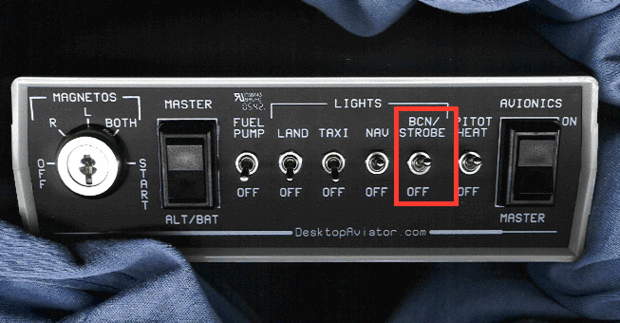 El faro que se encuentra en la parte superior de la cola de la aeronave debe ser controlado por un interruptor en algún lugar de la carlinga (cada lugar es diferente en esto). La mayoría de pilotos dejan este faro en todo el tiempo y pueden omitir este paso como el faro se enciende con el interruptor general.