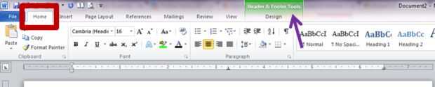 Una vez abierta esta ficha, puede cambiar el tipo y la fuente haciendo clic en la ficha Inicio. Como se puede ver el encabezado y pie de página herramientas verde es todavía visible.