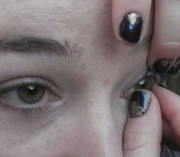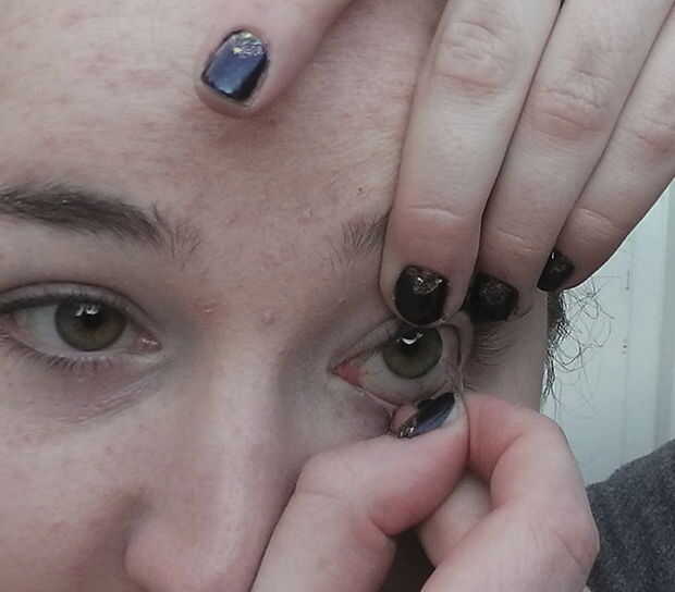 Utilizando su dedo índice y pulgar, pellizcar el contacto de sus ojos. El contacto se estará sentado en la porción coloreada del ojo. Desea aplicar presión con los dedos separados, pinch en y tire directamente hacia afuera. Toma un poco de presión para bajar el contacto; no duele, pero se puede sentir un poco extraño al principio.