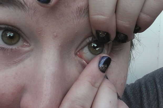 Ahora está listo para poner el contacto en. Mueve el dedo con el contacto hacia su ojo mirando usted mismo en el espejo con los dos ojos para saber dónde poner el contacto. Mantener ambos ojos abiertos por lo que bien puede colocar la lente.