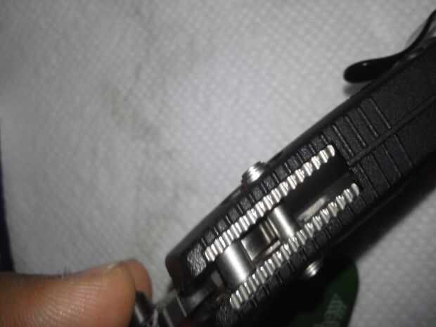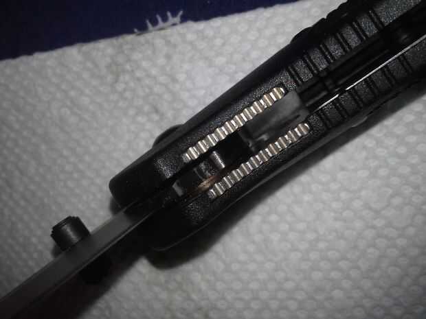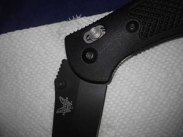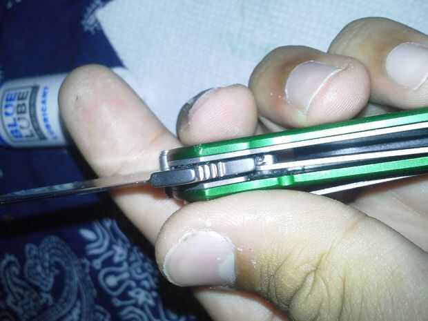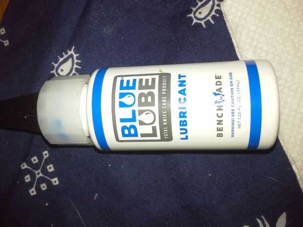 Abra el cuchillo y aplicar un poco de lubricante en el mecanismo de bloqueo y a ambos lados del punto de pivote. Luego, ciclo la navaja abierta y cerrada varias veces con la punta hacia arriba. Después de hacerlo durante un minuto, punto de la punta hacia abajo y el ciclo abre y cierra otra vez un par de veces. Entonces mantenga punta pulsado durante unos minutos. Esto va a salir todo el lubricante sobrante. Utilice un paño trapo o microfibra (nada sin pelusa) para reunir toda la lubricación excesiva.