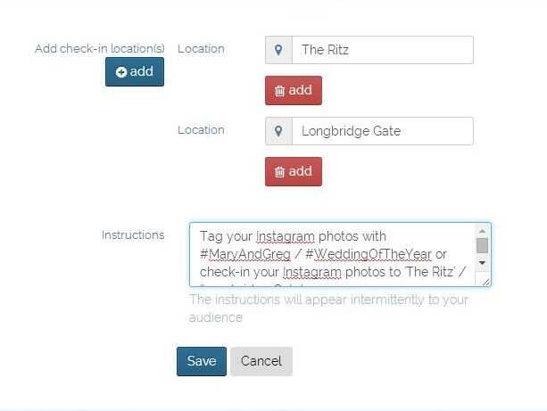 - Instrucciones: Nosotros automáticamente llenará esto con usted con los hashtags que ha elegido y llamado a la acción, pero se puede modificar el mensaje que tus invitados ver en las pantallas.
