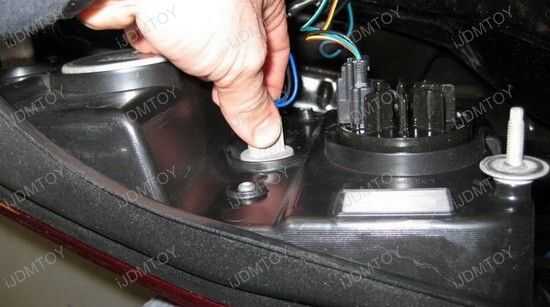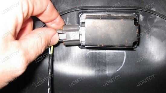 4) una vez desmontado, saque el ensamblaje de la luz del marco de vehicular. Una vez retirado el conjunto de la luz, fácilmente puede ver blanco conectores (2 en número) situados a ambos lados de la estructura vehicular. Estos conectores son los cables de conexión actuales para configurar las bombillas de luz de reversas en su coche.