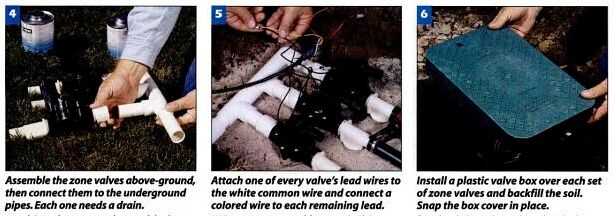 Dio a través de la vigueta del borde de su casa y ejecutar tubería de cobre y cable a través del orificio y a la tierra. Hacer la conversión de cobre a PVC a nivel del suelo con un conector roscado. Ejecute la línea principal de PVC, junto con el cable, a la primera ubicación de válvula de zona. Montar el válvula sistemas sobre el suelo y cemento a la tubería subterránea (foto 4). Instalar un drenaje de plástico, en línea en el lado aguas abajo de cada válvula y conecte los hilos del cable.
