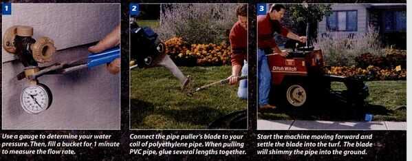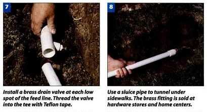 Un montaje en la rama roscada de una t de PVC de desagüe de latón del hilo de rosca e instalar el tee en un ángulo de 45 ° hacia abajo (foto 7). Excavan una pequeña depresión en el desagüe y llenarlo con arena y grava. Si has contratado un operador o alquilar una máquina, usted será capaz de alesaje debajo de aceras y calzadas con el accesorio del taladro. De lo contrario, túnel bajo estos obstáculos con la mano o use una pipa casera de la esclusa. Instale una boquilla de acentuado de la esclusa, disponible en los centros de origen, a un extremo de una longitud de tubo de PVC. Un conector de manguera al otro extremo de la tubería y zanjas poco profundas en lados de la acera de la oposición. Con la manguera conectada y el agua activada, repetidamente empujar el tubo hacia adelante y hacia atrás debajo de la acera para crear el agujero (Foto 8).