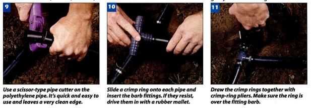 Tubería de polietileno se une a púa. Estos pueden fijarse por abrazaderas y anillos de prensado de acero inoxidable (abrazaderas Oetiker) son una opción mejor. Son baratos ($16 por 100) y son fácil de usar. Corte el tubo con un cortatubos de tipo tijeras (Foto 9). Deslizar un anillo de compresión de acero inoxidable en cada tubo e insertar la púa (foto 10). Los anillos en lugar de deslizar y apretarlos firmemente con las pinzas (foto 11). Instalación de las cabezas