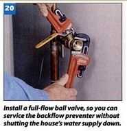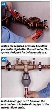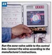Este tipo de contraflujo de vez en cuando se hacia atrás surge, por lo que tendrá un sumidero con un boquete de aire por debajo de ella. La cuenca a un desagüe de piso cerca de la pipa con tubo de 1 pulgada (foto 22). La tubería después de que el desconector también tendrá una válvula de drenaje, por lo que puede drenar la línea de arriba en invierno. Instale el panel de control en la pared conveniente. Pase el cable en el panel tira de los cables y conéctelos según las instrucciones del fabricante (foto 23). Fuera, tire los tapones de la regadera y enjuague la suciedad de cada zona. Cuando el agua salga limpia, instalar los filtros de arena y boquillas y realizar ajustes de ángulo y volumen en la cabeza.