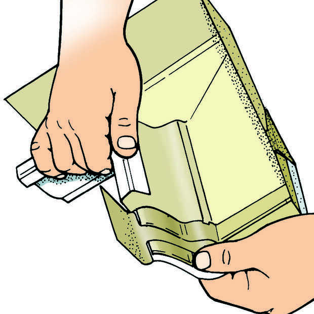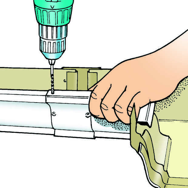 Comenzar con la instalación de un empalme de junta deslizante en cada extremo del interior de la esquina guarnición. Deslice los empalmes como iré. Luego, cortar la primera sección del canalón a medida con unas tijeras. Usar un cuadrado y un lápiz para marcar la longitud de la canal y corte a la línea. Si el hojalatero distorsiona el perfil del canal, sólo doblar nuevamente dentro de forma con los alicates. Material de canal también se puede cortar con una sierra de cortar o sierra de sable, pero asegúrese de limpiar las limaduras de acero de la superficie pintada.