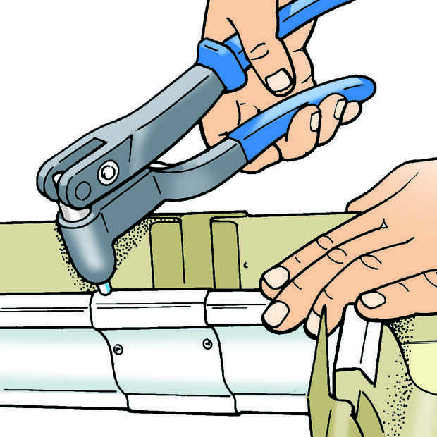 Para sujetar estos componentes, se pueden utilizar ya sea corta chapa los tornillos o remaches Pop. Los remaches son más trabajo, pero son más atractivos y no dejan piunts fuerte dentro del canal. Si usted elige remaches, comenzar taladro varios agujeros de 1/8 de pulgada a través de la conexión en el agujero. Cuando llegue al fondo hacia fuera, aprieta el gatillo varias veces hasta que el remache se aplana y tijeras de la madre.