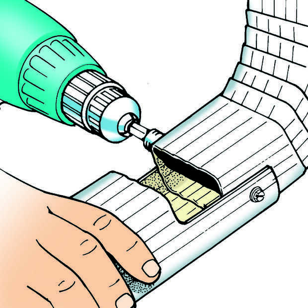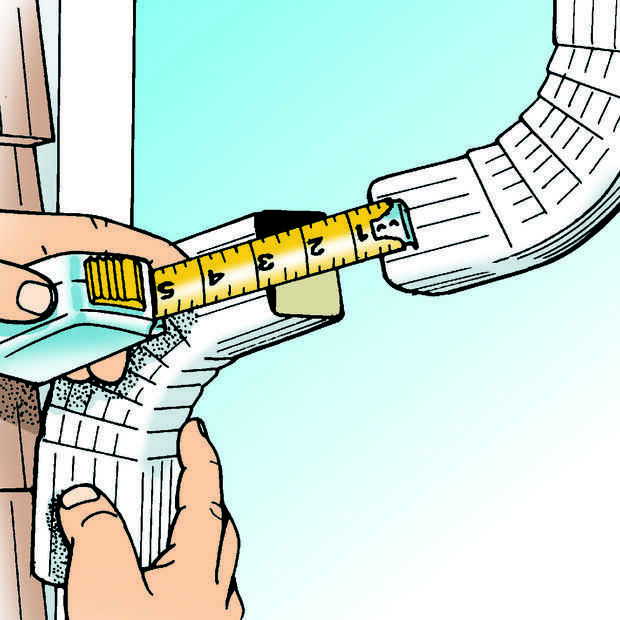 Instale dos soportes de bajada de agua en forma de U en la esquina de la casa, uno alto y uno bajo. Hacer la bajada de agua de 1 pie de la tierra e instalar el último codo. Finalmente, corte una muesca en un extremo de una longitud de 36 pulgadas de bajada de agua para hacer una extensión dobla-para arriba. Sólo cortar varias pulgadas de la parte superior la mitad y atornille la extensión al codo por cada lado. Este arreglo ofrece el agua lejos de la casa, pero le permite a la punta para arriba las extensiones cuando cortar su césped.