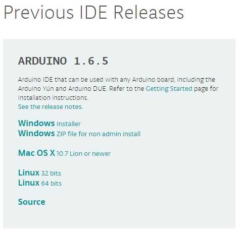 En primer lugar, necesitamos instalar el IDE de Arduino. A partir del 11/12/2015, chipKIT-core solamente funciona en Arduino versión 1.6.5 (no 1.6.6) pero esto se debe solucionar pronto. Ve a esta página para agarrar 1.6.5 y haga clic en el instalador correspondiente para su sistema operativo.
