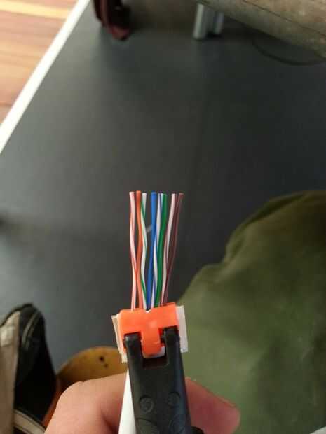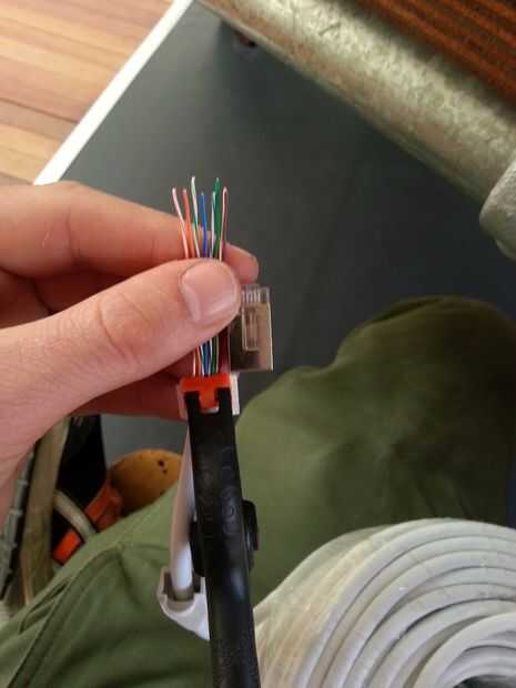 La imagen está mal aquí, usted debe cortar camino más corto! Al final, el enchufe debe cubrir el grueso blindaje del cable de red.