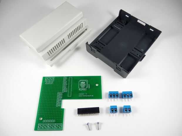 Verifique si tienen todas las piezas del kit de DIY de RasPiBox - PCB, un encabezado mujer 2 x 13, dos bloques de terminales de 3 pines, dos bloques de terminales de 2 pines, 2 tornillos Self-taping, recinto molido