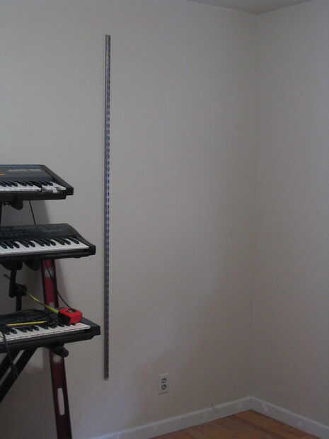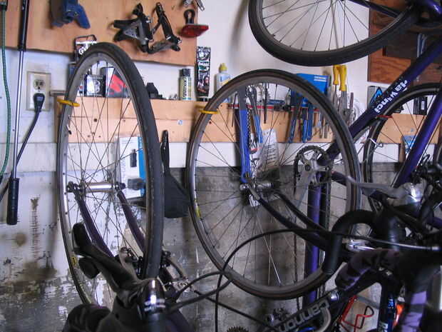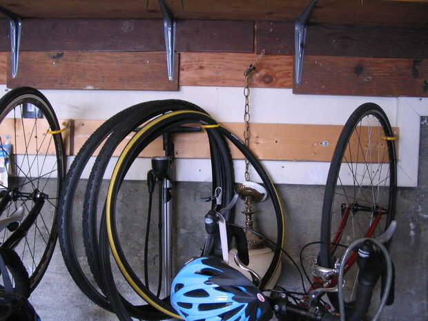 Si no tienes clavos, o no están en la ubicación correcta, instale un 2 x 4 o 2 x 6 plana contra la pared anclada en algo sólido y fijar las normas a esta "placa del golpeador" (no sé lo que esto se llama correctamente, por lo que sólo utilizo terminología de muro de escalada). He fijado las placas del golpeador con tirafondos en los tacos y tornillos de mampostería hormigón desnudo y ladrillos o mampostería yeso y torno. En las imágenes, se puede ver una placa de kicker que até con tirafondos a postes de madera en el garaje; ganchos de bicicleta se atornillan en esta placa del golpeador en lugares específicos.
