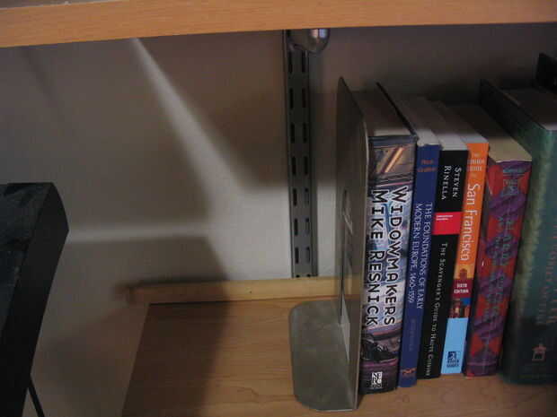 tomé algunos pedazos de desecho de la madera para crear un tope trasero para los libros. Sin el respaldo, si usted presiona los libros contra la pared, no deslizarlas más allá de las normas.