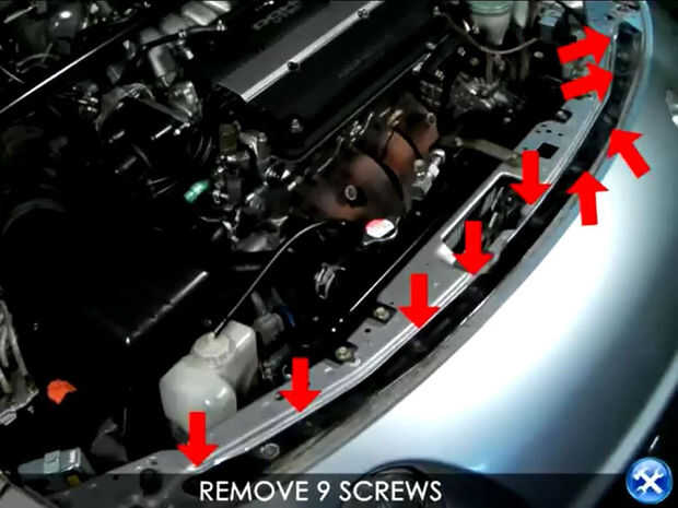 4. quitar 9 Screws.The superior del parachoques delantero se mantiene presionado por 9 tornillos. Utilice un destornillador Phillips para eliminarlos.