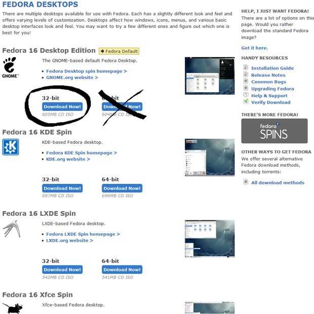 Lo primero que vas a necesitar es la ISO, la imagen de disco que contiene todos los archivos de Fedora ejecutar. Usted puede obtener Fedora aquí y guárdelo en un lugar fácilmente accesible. Asegúrese de que la imagen es actualizada y seleccionar 32 bits. No queremos usar 64 bits porque nos estamos esforzando para portabilidad aquí, y muchos ordenadores son compatibles no 64 bits, así que utiliza 32 bits (a menos que sepa lo que está haciendo, o solo quieres arrancar el pendrive en máquinas de 64 bits). Como alternativa, puede obtener Fedora a través de un cliente de bit-torrent, puedes hacerlo accediendo aquí y haciendo clic en el escritorio de Fedora Live Media i686 - Live CD. La herramienta que utilizaremos más adelante tiene la opción para descargar Fedora, pero no recomiendo usarlo, como no ha funcionado bien para mí en el pasado.