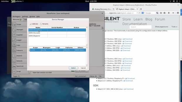 Formas de onda de 2015 es una pieza de software desarrollado por Digilent diseñado para uso con el Analog Discovery 2, Descubrimiento análogo, EE Juntao Analog Discovery 2 NI edición.Proporciona la interfaz de usuario para un osciloscopio de canal 2,