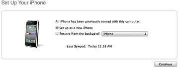 Una vez que iTunes nuevamente entra en acción y todo restaurado, haga clic en establecer para arriba como un iPhone nuevo, a continuación, haga clic en continuar. Entonces hecho.