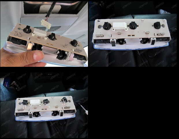 6.) móviles en la parte delantera del vehículo donde están las luces de mapa, usar una herramienta para tariceria (o tarjeta de crédito si usted no tiene uno; es importante utilizar una pieza de plástico de amplia base en lugar de una pieza de metal para evitar dañar la moldura) para quitar la parte posterior del mapa de caja de luz. Desconecte todos los arneses asociados a los controles de ventana de techo.